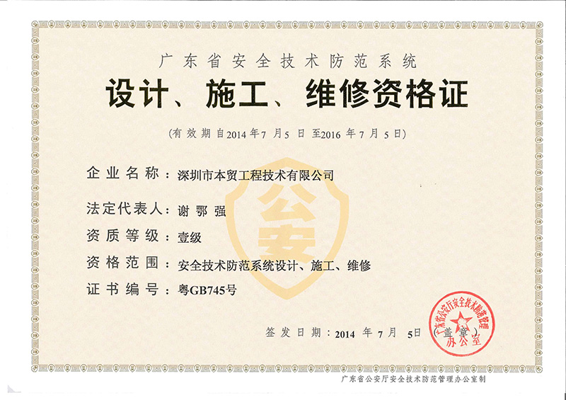 喜訊,我公司安防資質“設計、施工、維修資格證”已于2014年9月順利晉升為壹級!